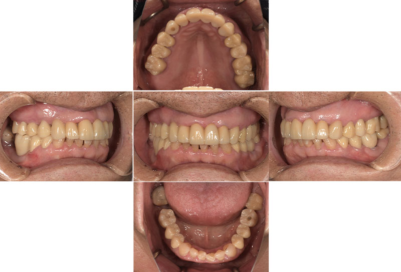 過去に治療した被せものが古くなり、特に奥歯がボロボロの状態になっている為、ごはんが食べ辛くなっていました。更に口臭も気になるとの事でした。奥歯のインプラント治療を期に全ての悪い歯を治療し、ずれていたかみ合わせも治療させて頂きました。銀歯を全て除去し、まるで本物のような歯を再現した事で一気に口元が若返りました。